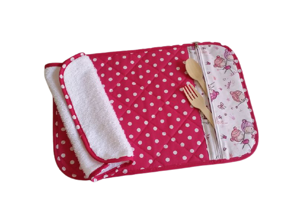 Παιδικό σουπλά φαγητού για νηπιαγωγείο, παιδικό σταθμό,σχολείο , πικ νικ ή για το σπίτι . Φτιαγμένο από βαμβακερά υφάσματα . Περιλαμβάνει θήκη με φερμουάρ για χαρτοπετσέτα και κουταλάκι ή πιρουνάκι. Πλένεται στους 30 βαθμούς και σιδερώνεται. Διπλώνεται και κλείνει με κουμπάκι. Συνοδεύεται με μικρι πετσετούλα χεριών 25*25 εκ. περιπου.