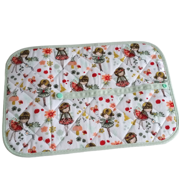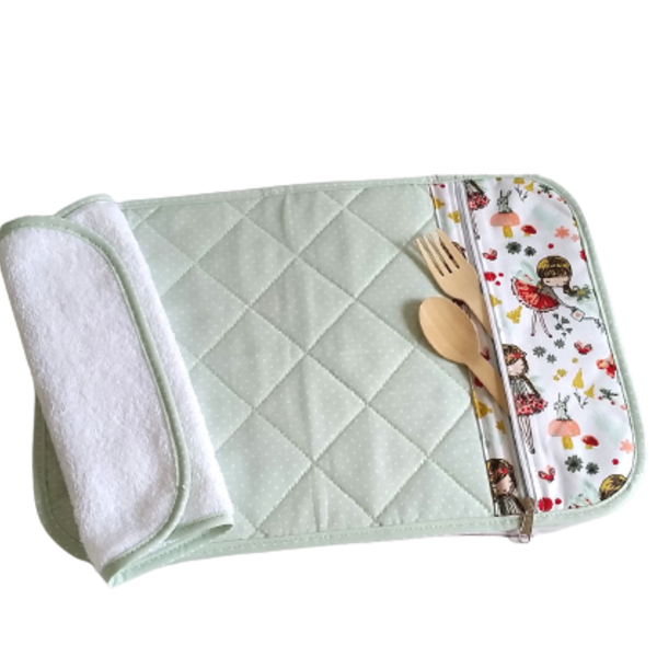 Παιδικό σουπλά φαγητού για νηπιαγωγείο, παιδικό σταθμό,σχολείο , πικ νικ ή για το σπίτι . Φτιαγμένο από βαμβακερά υφάσματα . Περιλαμβάνει θήκη με φερμουάρ για χαρτοπετσέτα και κουταλάκι ή πιρουνάκι. Πλένεται στους 30 βαθμούς και σιδερώνεται. Διπλώνεται και κλείνει με κουμπάκι. Συνοδεύεται με μικρι πετσετούλα χεριών 24*24 εκ. περιπου.