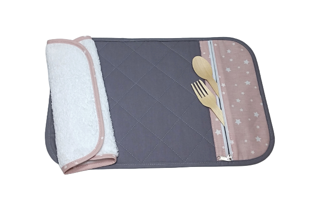 Παιδικό σουπλά φαγητού για νηπιαγωγείο, παιδικό σταθμό,σχολείο , πικ νικ ή για το σπίτι . Φτιαγμένο από βαμβακερά υφάσματα . Περιλαμβάνει θήκη με φερμουάρ για χαρτοπετσέτα και κουταλάκι ή πιρουνάκι. Πλένεται στους 30 βαθμούς και σιδερώνεται. Διπλώνεται και κλείνει με κουμπάκι. Συνοδεύεται με μικρι πετσετούλα χεριών 24*24 εκ. περιπου.