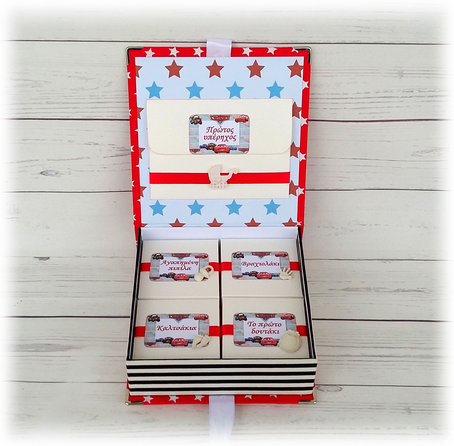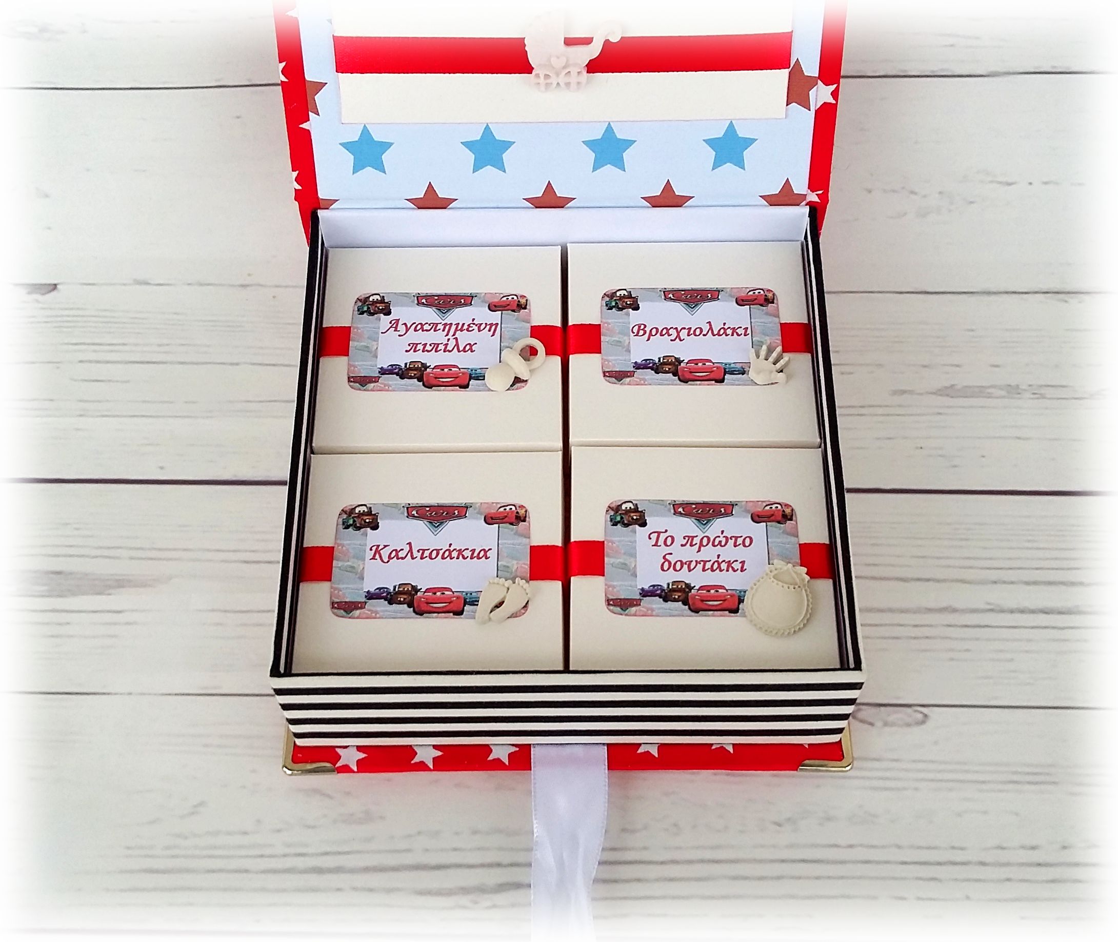Περιέχει 4 μικρά κουτάκια στα οποία μπορείτε να φυλάξετε τα πρώτα μαλάκια του μωρού σας,το βραχιολάκι από το μαιευτηριο,ομφάλιο λώρο,τα πρώτα του καλτσάκια,την αγαπημένη του πιπίλα , το πρώτο του δοντάκι, κοσμήματα , μαρτυρικά, νυχάκια , το πρώτο κεράκι γενεθλίων ( Σηµειώστε την επιλογή σας στα σχόλια της παραγγελίας).