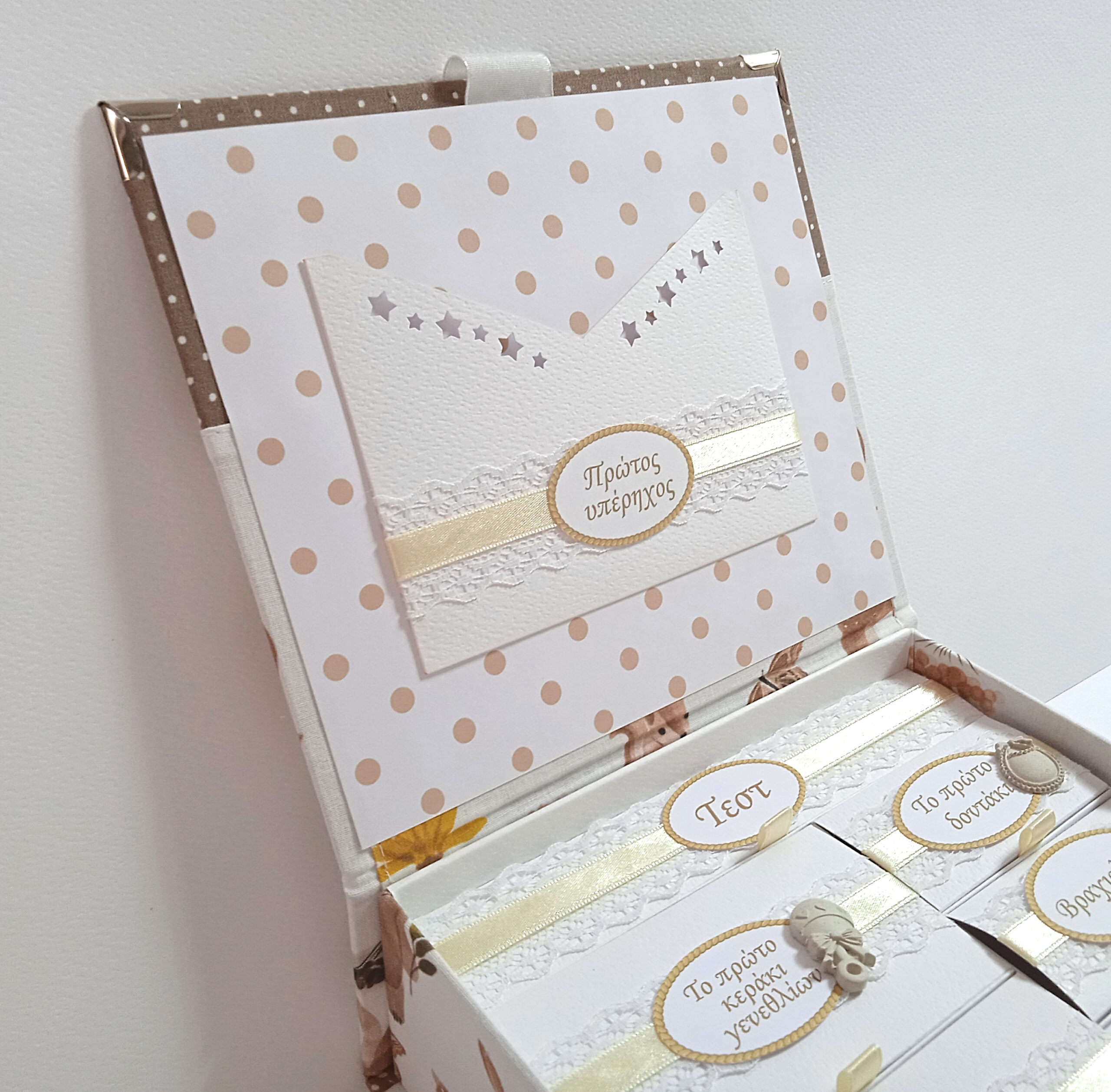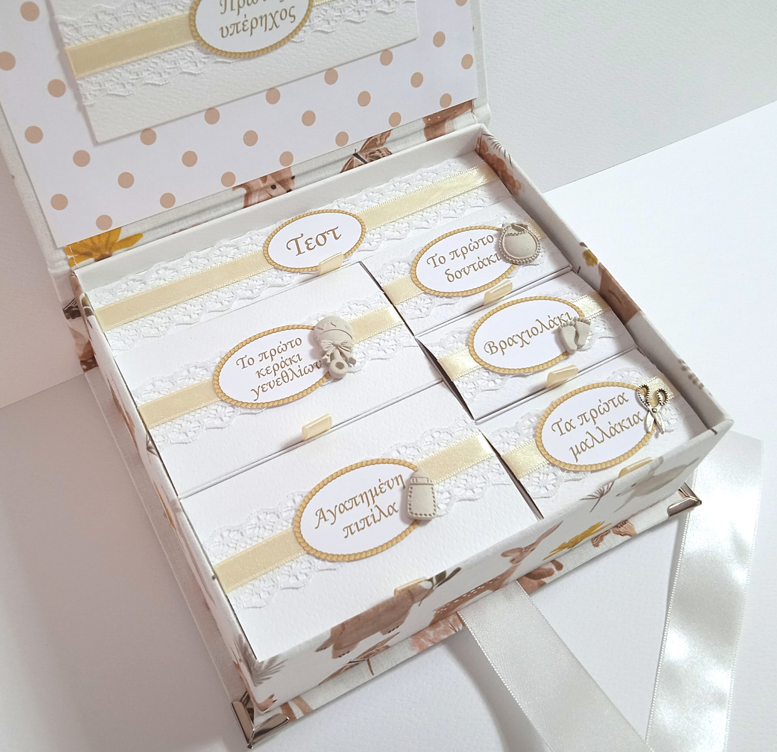 Περιέχει 6 μικρά κουτάκια στα οποία μπορείτε να φυλάξετε τα πρώτα μαλάκια του μωρού σας,το βραχιολάκι από το μαιευτηριο,ομφάλιο λώρο,τα πρώτα του καλτσάκια,την αγαπημένη του πιπίλα , το πρώτο του δοντάκι , κοσμήματα , μαρτυρικά, νυχάκια , το πρώτο κεράκι γενεθλίων ( Σηµειώστε την επιλογή σας στα σχόλια της παραγγελίας).