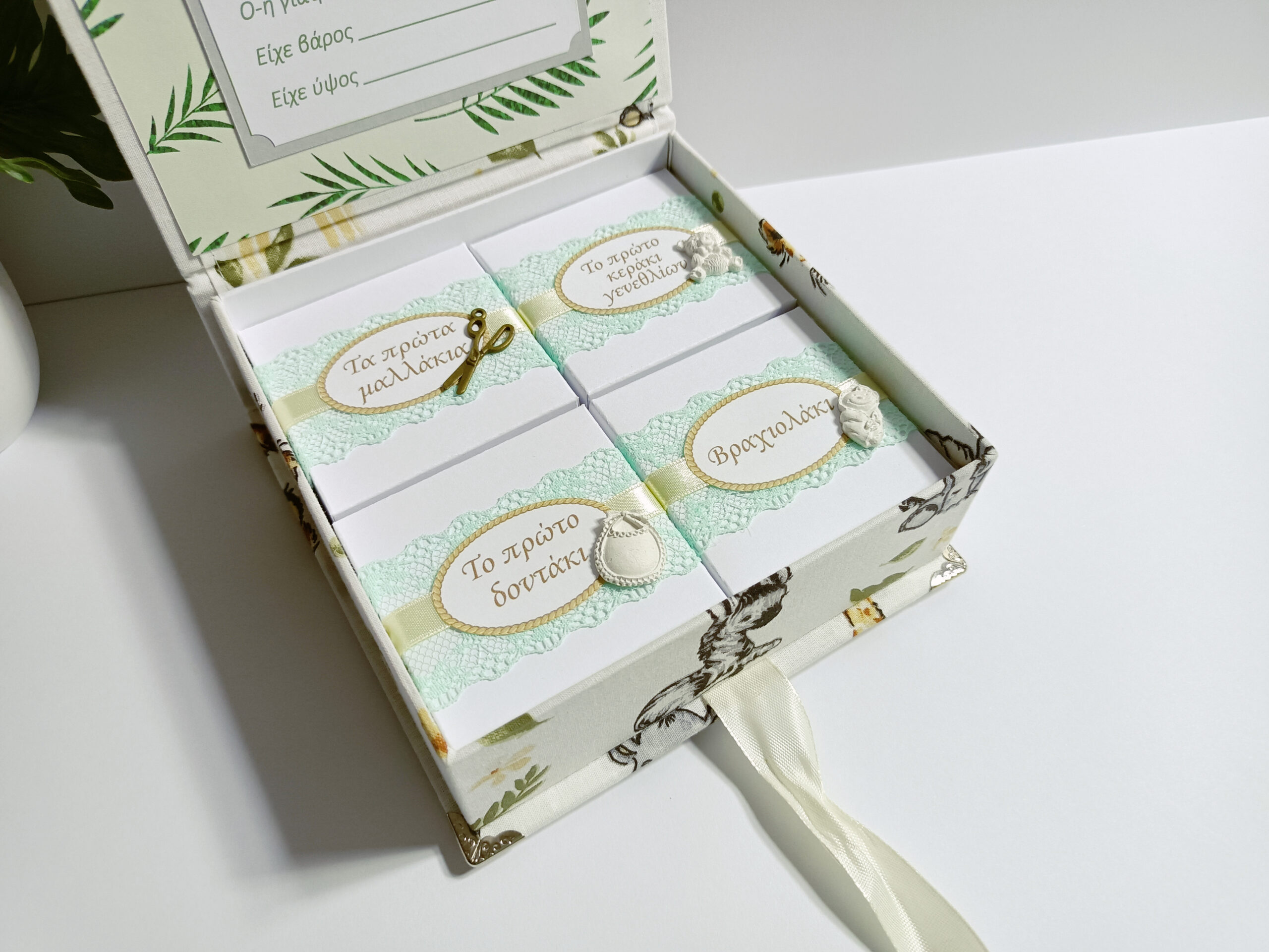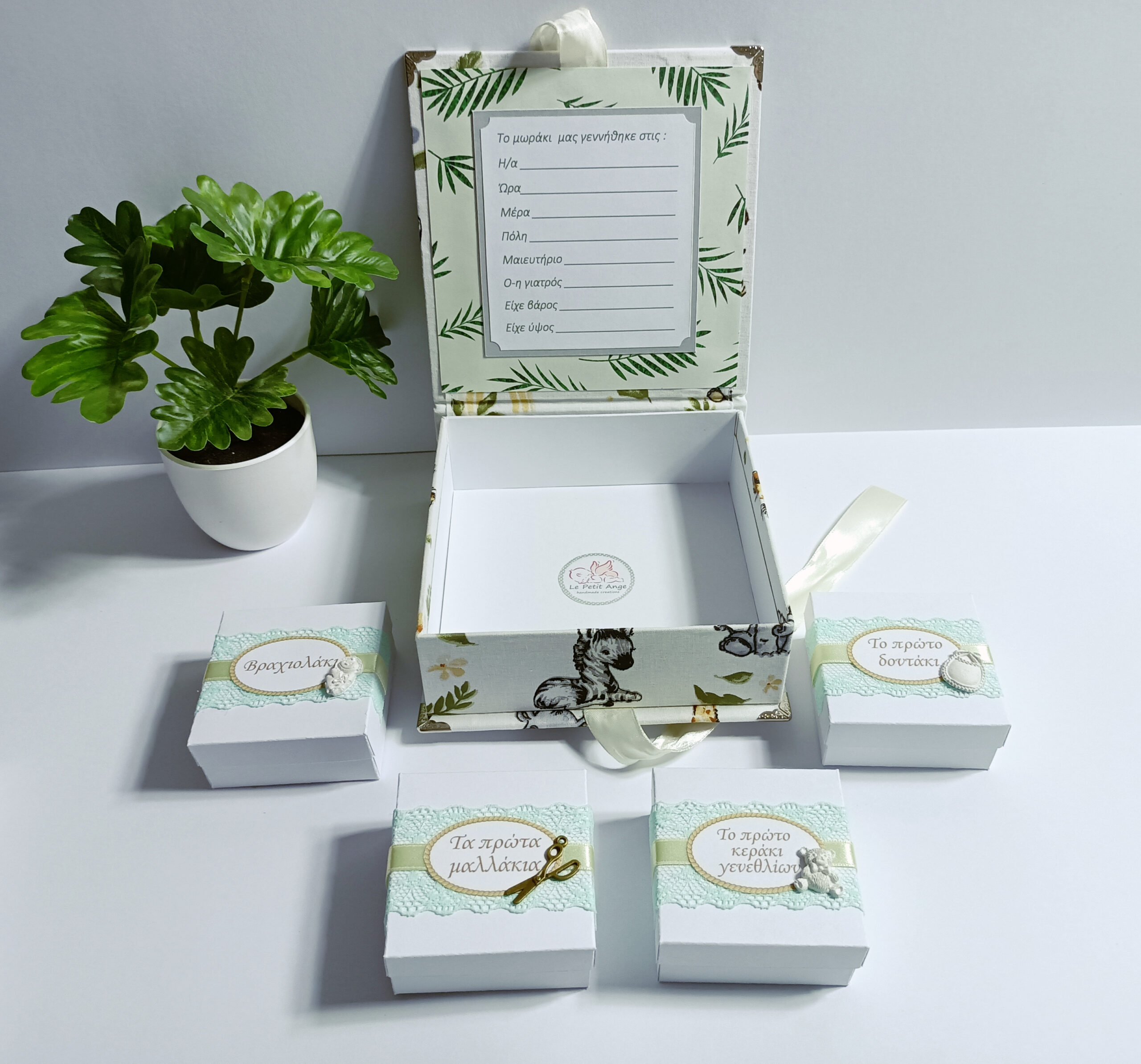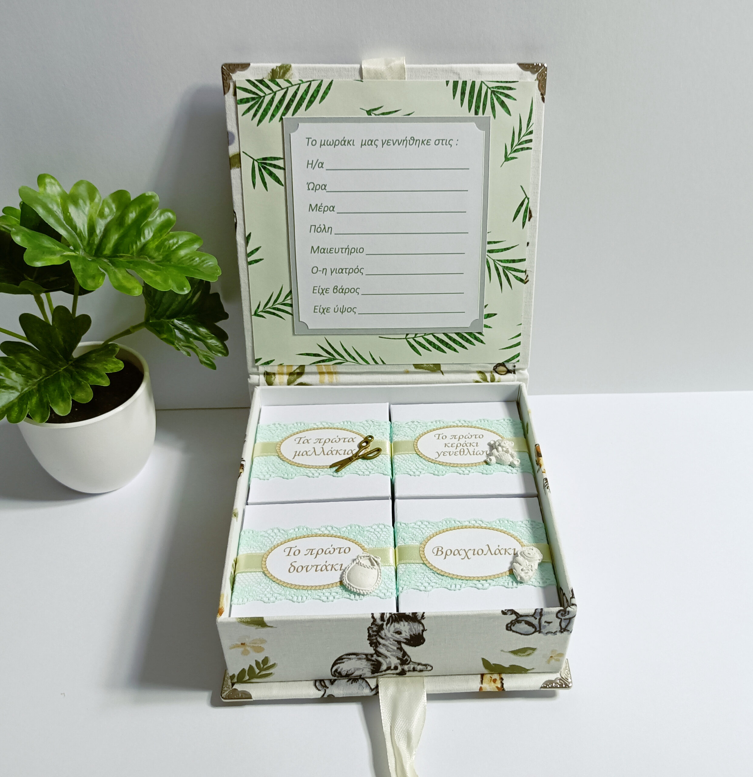 Περιέχει 4 μικρά κουτάκια στα οποία μπορείτε να φυλάξετε τα πρώτα μαλάκια του μωρού σας,το βραχιολάκι από το μαιευτηριο,ομφάλιο λώρο,τα πρώτα του καλτσάκια,την αγαπημένη του πιπίλα , το πρώτο του δοντάκι, κοσμήματα , μαρτυρικά, νυχάκια , το πρώτο κεράκι γενεθλίων ( Σηµειώστε την επιλογή σας στα σχόλια της παραγγελίας).